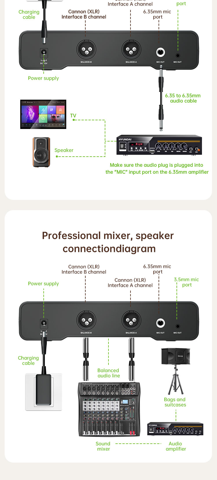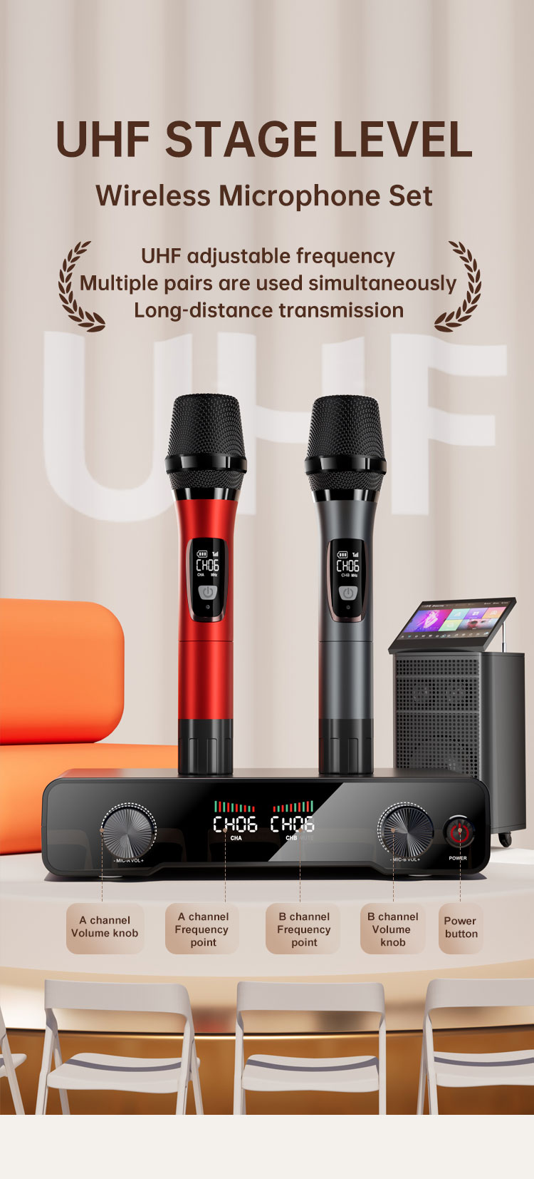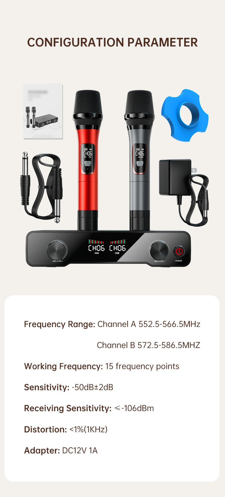 This product is a professional stage wireless microphone system, supporting independent A/B channel balanced audio output interfaces (XLR) and 6.35mm and 3.5mm unbalanced audio outputs. The receiver features a built-in antenna and a simple design, making it widely applicable to large mixing consoles, outdoor sound systems, amplifiers, portable PA systems, and other audio equipment.