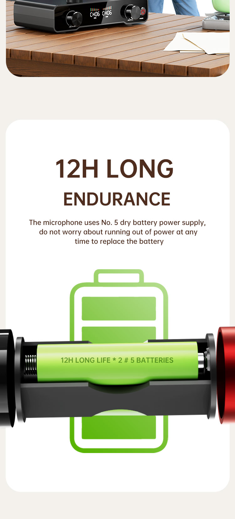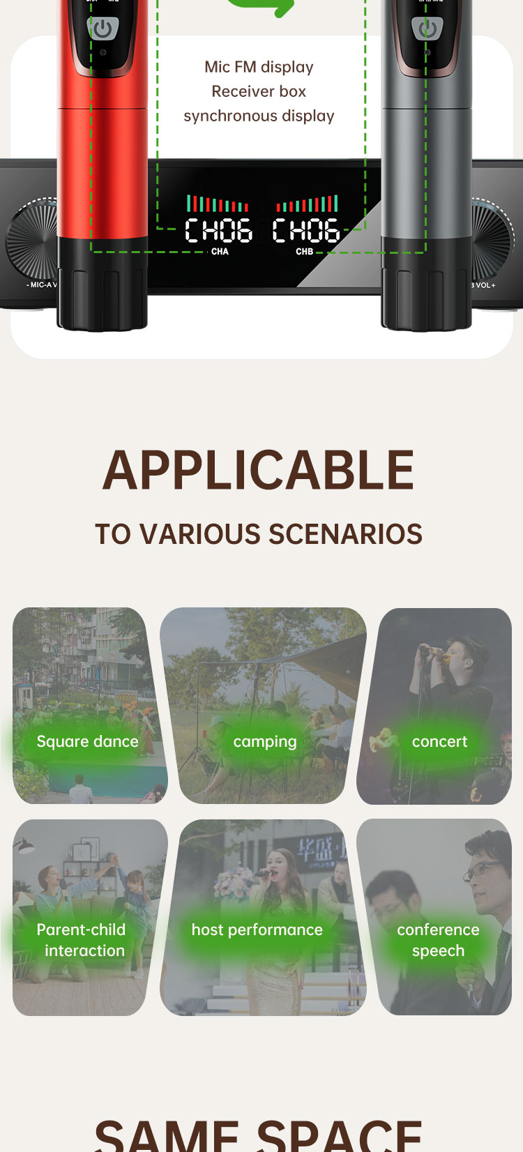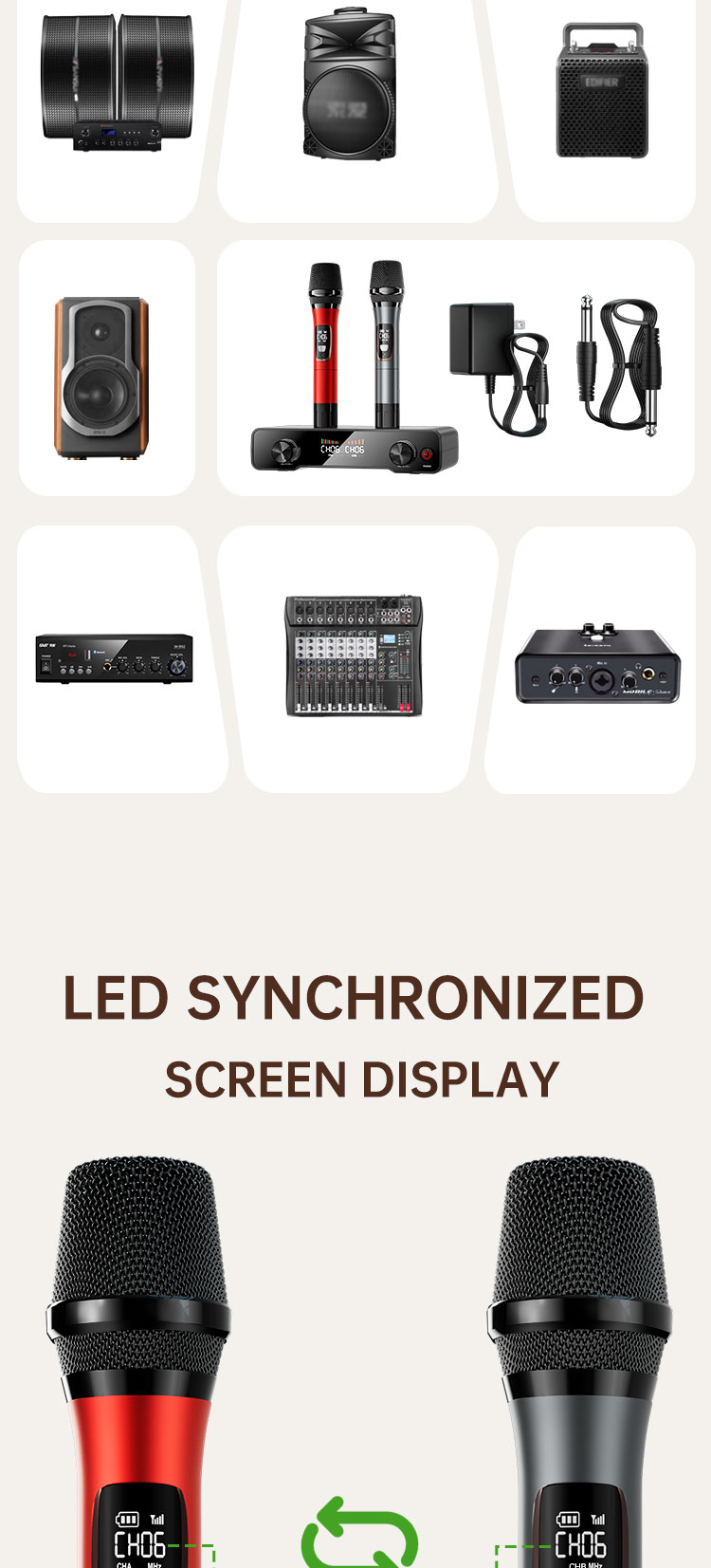 This product is a professional stage wireless microphone system, supporting independent A/B channel balanced audio output interfaces (XLR) and 6.35mm and 3.5mm unbalanced audio outputs. The receiver features a built-in antenna and a simple design, making it widely applicable to large mixing consoles, outdoor sound systems, amplifiers, portable PA systems, and other audio equipment.